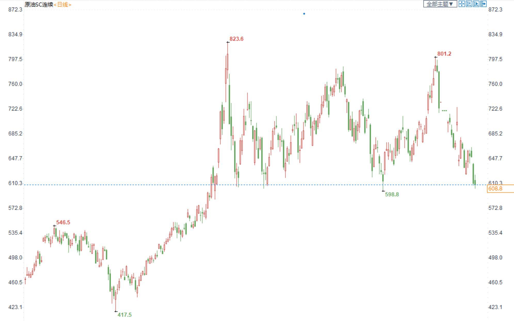 期货市场,布油在84美元附近震荡整理,国内SC2211合约大幅收跌,收盘价608.8。