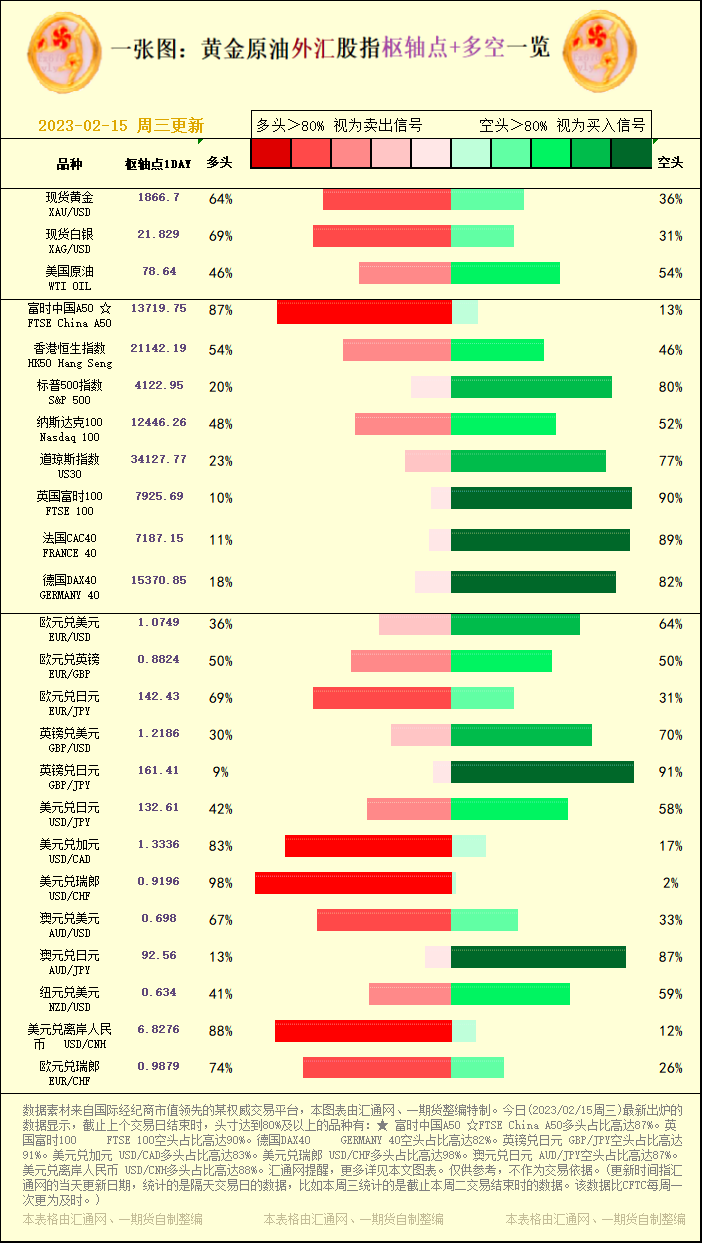 一张图:黄金原油外汇股指"枢纽点+多空占比"一览(2023/02/15周三)