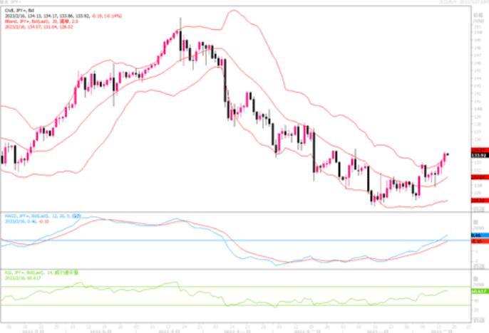 周三(2月15日)在美国公布高于预期的通胀数据后,美元兑日元盘中曾急升至134.355,为1月6日以来最高。但尾市收盘阶段自高位略有回落,收盘于134.13水平。美国通胀率仍居高水平,美联储基准利率峰值预期不断提高,提振者美元兑日元的继续自低位反弹之中。技术图形上,周三K线上继续显示阳柱体,美元兑日元已攻克10月至1月跌势的23.6%技术位133.05,增加了牛市的倾向。日线动能指标为正。继续上行的话,若穿破135.00心里关口,上方136.66的38.2%回撤位发将是多头的进攻目标。但短线4小时图上出现超买,应防范美元兑日元短期获利回吐调整风险的出现。