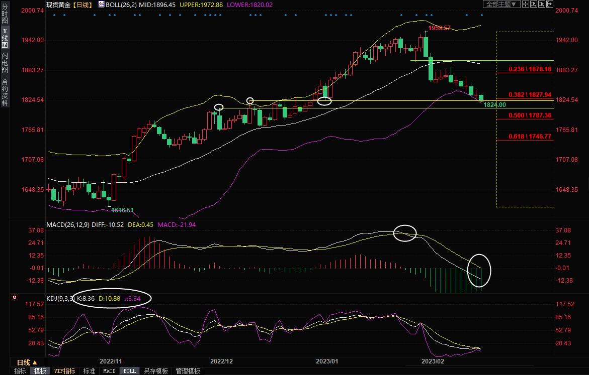 上方初步阻力在5日均线1841.40附近,然后是1850关口,55日均线阻力在1860.77附近,由于KDJ也发出了短线超卖信号,如果金价意外收复55日均线,则削弱后市看空信号。