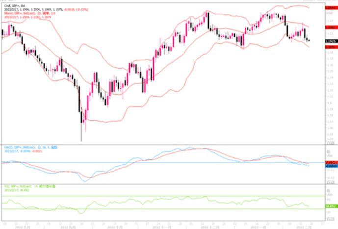 周四(2月16日)英镑兑美元下滑0.5%至1.1985美元,盘中最低曾到过1.1966。美国经济数据继续超预期逞强提振美元走强是主要影响因素外,周四当天英国方面公布英国1月通胀放缓幅度超过预期,有迹象表明,英国央行密切关注的服务业等部分经济领域的价格压力正在降温。英国央行已经暗示可能在3月停止加息,而通胀数据强化了这一观点。如此,仅在息差这一项影响因素上,就将英镑摆在了不利的一面。日线图上,英镑兑美元开始跌落各短期均线下方,汇价运行在布林带通道的下轨,各项技术指标朝下摆动,表明英镑偏于弱势。短期内,2月初到过的低位1.1961将会经受考验,若跌穿,将威胁之前大的横盘区间下沿1.18附近水平。目前在日线图上,到底是形成双顶还是双底形态,还需进一步观察。