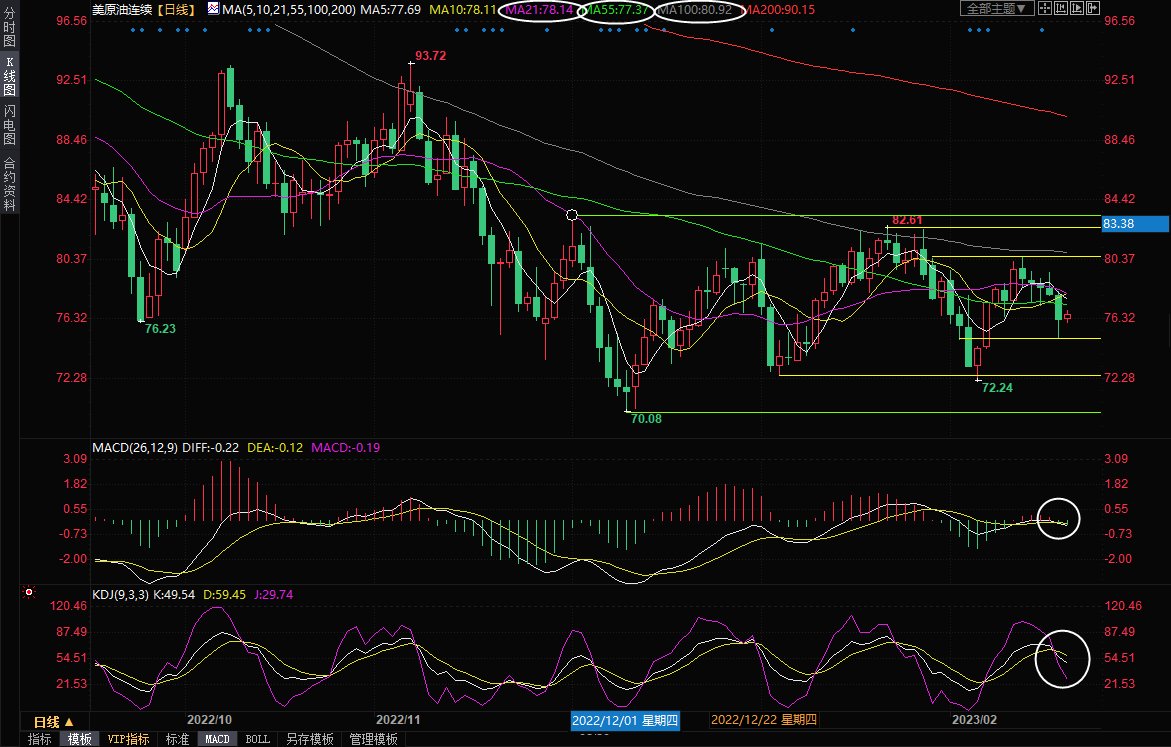 日线级别:震荡;MACD轻微死叉,KDJ死叉,油价回落至布林线中轨和所有均线下方,在收复55日均线77.37前,短线略微偏向空头,初步支撑参考日内低点76.07附近,上周五低点支撑在75.05附近,布林线下轨支撑在74.31附近,如果失守该支撑,将增加短线看空信号。