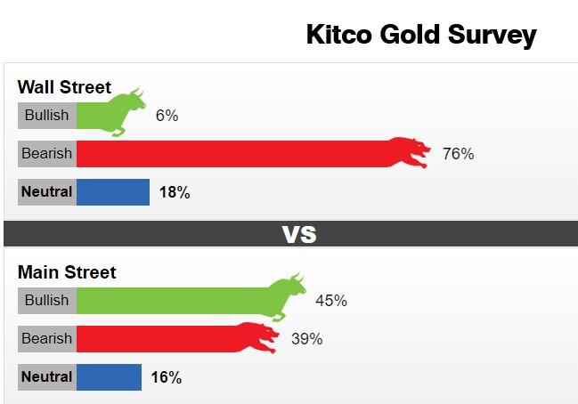 上周,17位华尔街分析师参与了Kitco?News黄金调查。在参与者中,有13位分析师(76%)看空金价。与此同时,只有1位分析师(6%)看好未来一周黄金的走势,3位分析师(18%)认为黄金将横盘震荡。