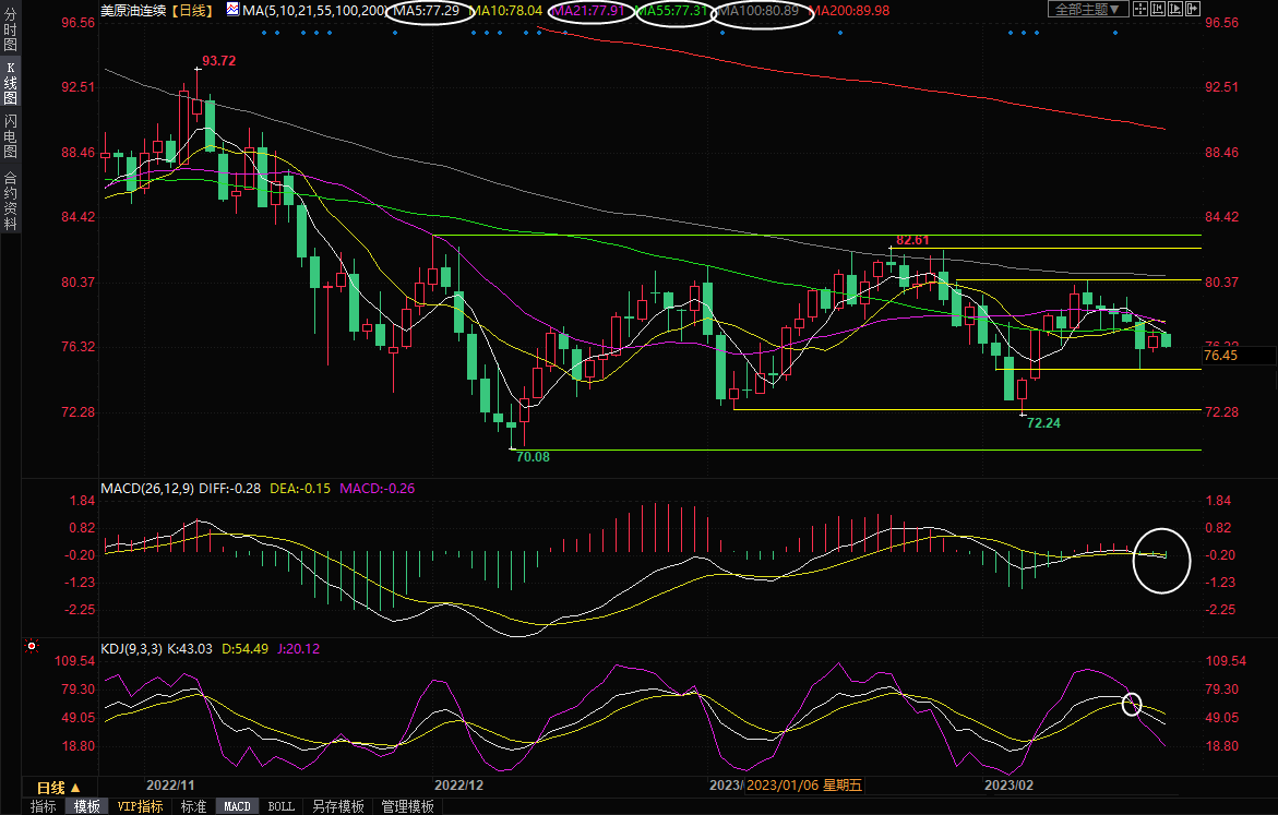 日线级别:震荡;MACD死叉,KDJ死叉,油价反弹受阻于55日均线,5日均线下穿10日均线,短线油价偏向空头,初步支撑参考周一低点76.05附近,上周五低点支撑在75.05附近,布林线下轨支撑在74.16附近,如果失守该支撑,则增加短线看空信号;1月5日低点支撑在72.44附近。