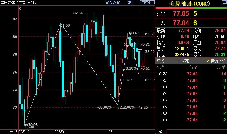 北京时间16:22,NYMEX原油期货上涨0.74%至77.11美元/桶;ICE布伦特原油期货下跌0.48%至83.41美元/桶。(注:由于恰逢美国公共假期,NYMEX原油周一(2月20日)没有结算价。)
