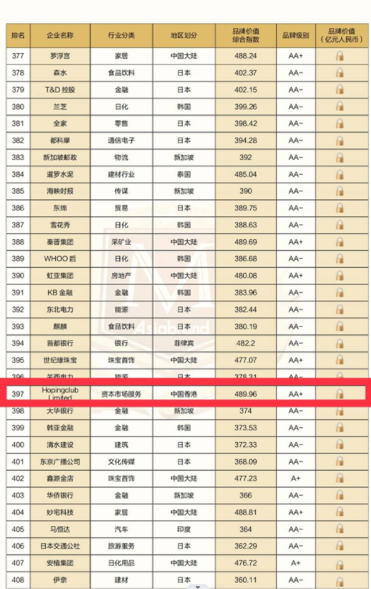 标题:亚洲品牌500强榜单中“Hoping club华英会”赫然在列