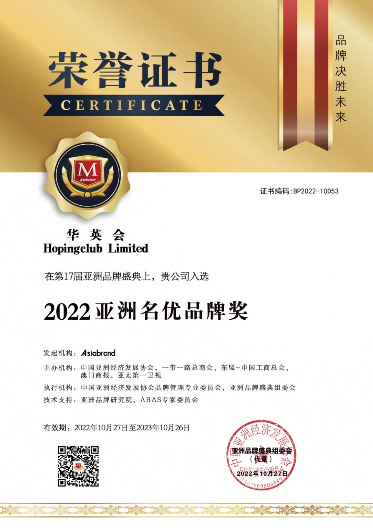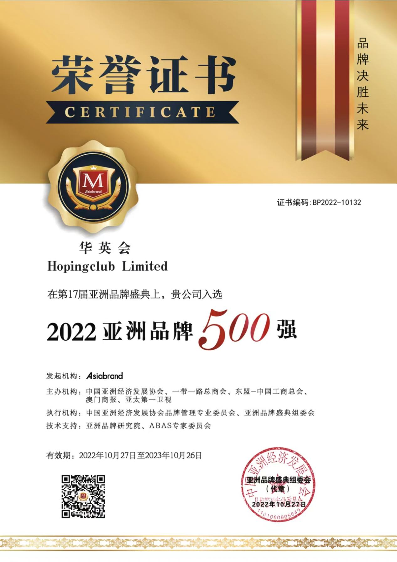 亚洲品牌500强榜单中“Hoping club华英会”赫然在列