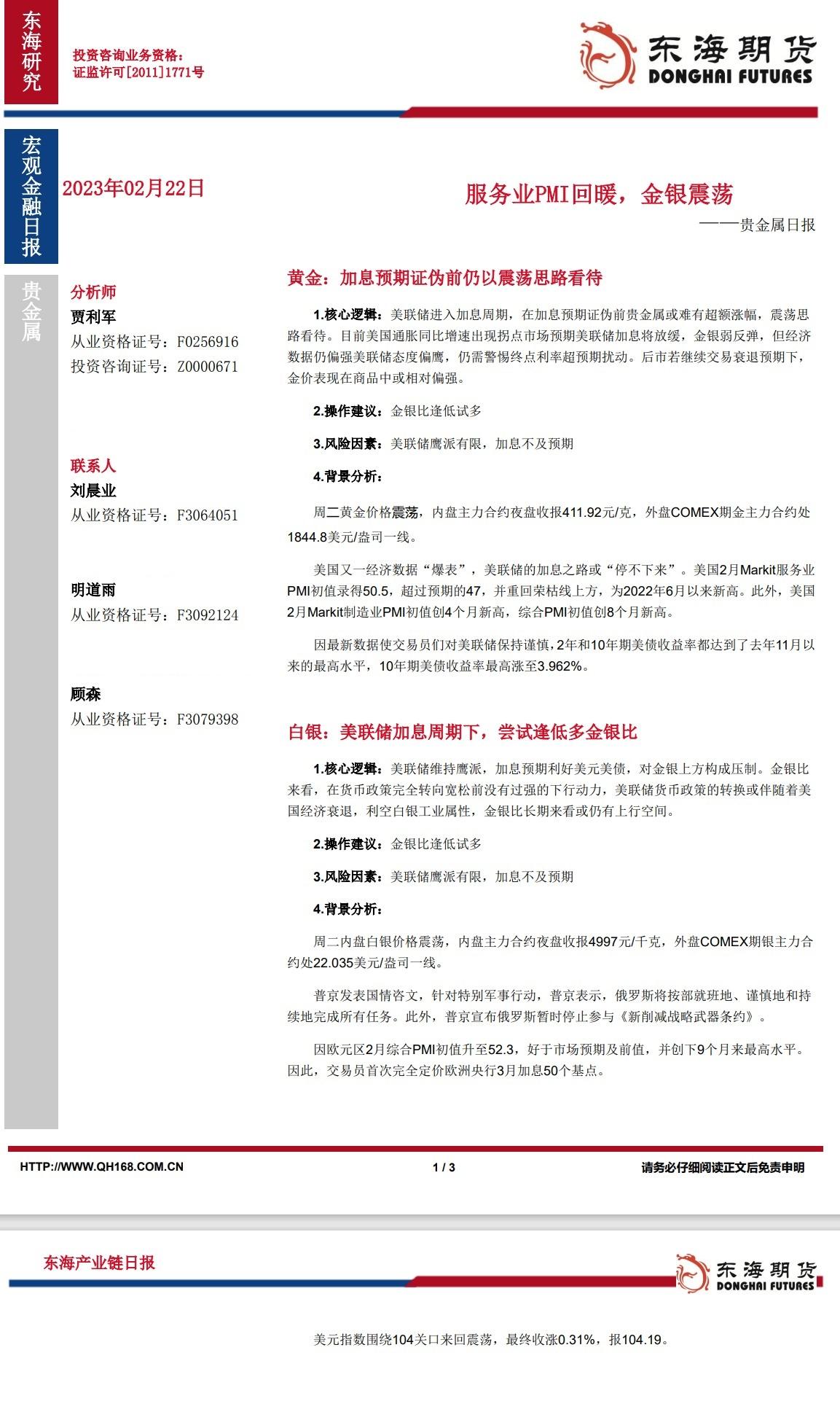 标题:【东海期货2月22日产业链日报】贵金属篇:服务业PMI回暖,金银震荡