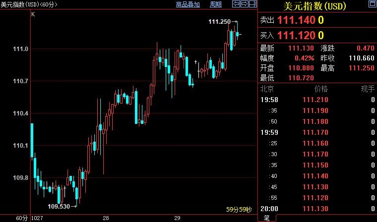 北京时间19:59,现货黄金下跌0.32%至1639.75美元/盎司;COMEX期金主力合约下跌0.11%至1643.0美元/盎司;美元指数上涨0.41%至111.128。