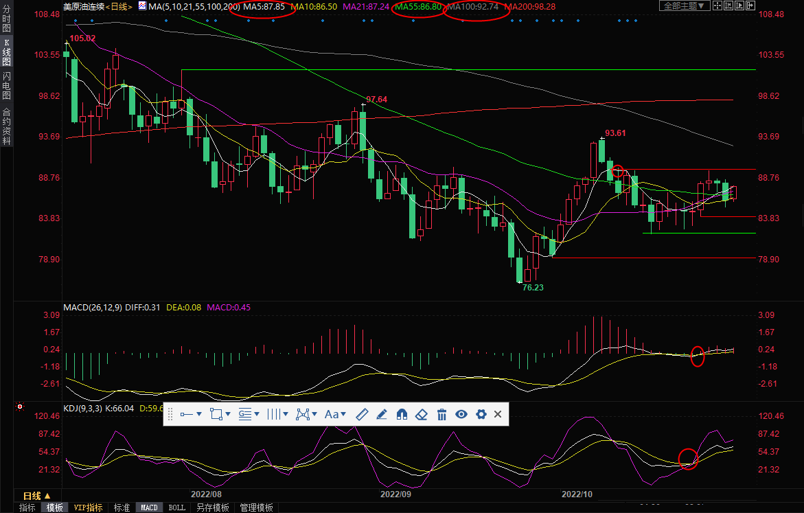 下方初步支撑在55日均线86.80附近,布林线中轨支撑在86.01附近,若油价回落至该位置下方,则增加短线看空信号;进一步支撑参考10月26日低点84.14和10月18日低点82.06附近位置。