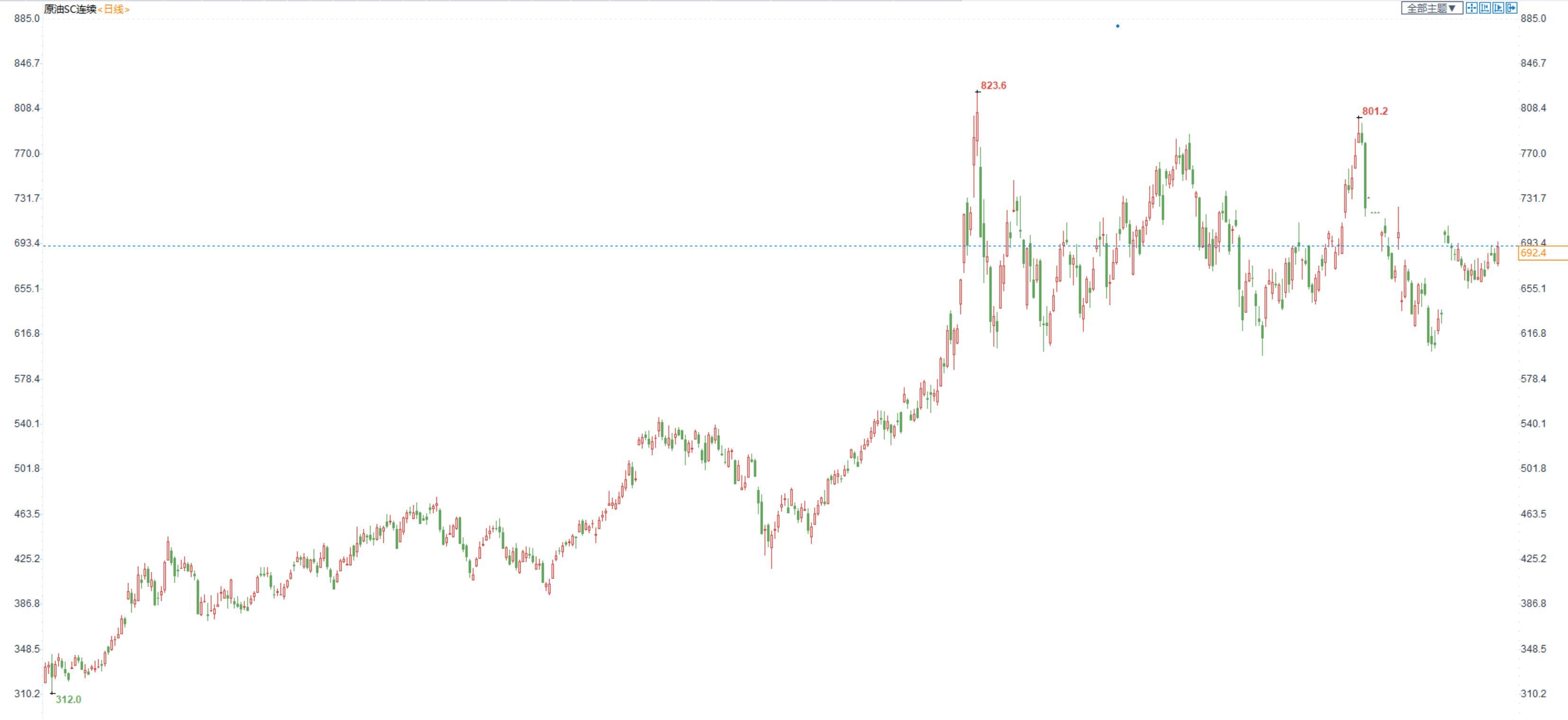 期货市场,布油在94美元附近震荡整理,国内SC2212合约小幅收涨,收盘价692.4。