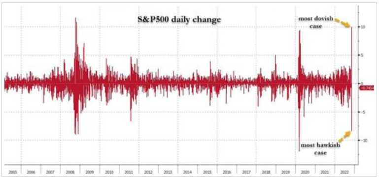 1.加息50个基点,并举行温和的新闻发布会:“鉴于通胀水平和劳动力市场紧张,很难想象会出现这种结果。如果出现这种结果,立即的反应可能会为股票带来两位数的单日回报率?!?标准普尔500指数将上涨10%至12%。