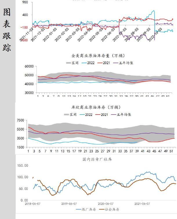 供应端:据美国能源信息署最新数据显示,截止2022年10月21日当周,包括战略储备在内的美国原油库存总量8.41663亿桶,比前一周下降829万桶;美国商业原油库存量4.39945亿桶,比前一周上涨258.8万桶;战略原油库存量4.01718亿桶,比上一周下降341.7万桶;美国汽油库存总量2.0789亿桶,比前一周下降147.8万桶。商业原油库存比去年同期高2.12%,比过去五年同期低1.17%;汽油库存比去年同期低3.64%,比过去五年同期低约6.70%;馏份油库存比去年同期低14.89%,比过去五年同期低20.21%。