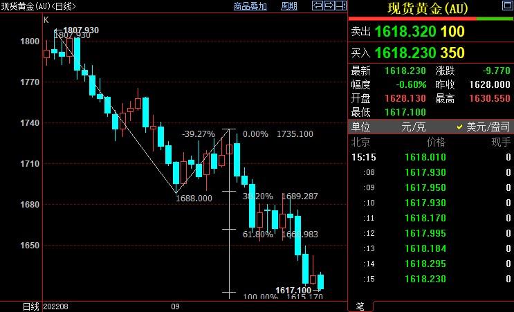 北京时间15:17,现货黄金下跌0.68%至1617.94美元/盎司;COMEX期金主力合约下跌0.66%至1625.4美元/盎司;美元指数上涨0.40%至114.620。