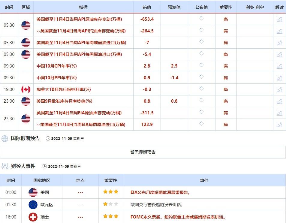 ③11月9日(周三)关键字:美国截至11月4日当周API和EIA原油库存变动,纽约联储主席威廉姆斯?