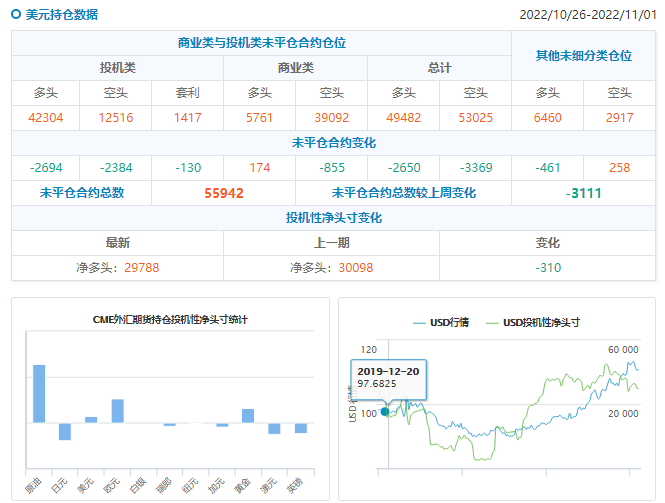 根据计算和美国商品期货交易委员会(CFTC)周五公布的数据,截至11月1日当周,美元净多头头寸骤降至30.8亿美元,为2021年8月17日来最低。?CFTC数据还显示,最近一周日元净空头合约由102618手降至77620手。芝加哥国际货币市场(International?Moary?Market)的美元仓位是根据日元、欧元、英镑、瑞郎、加元和澳元这六种主要货币的净仓位计算得出的。