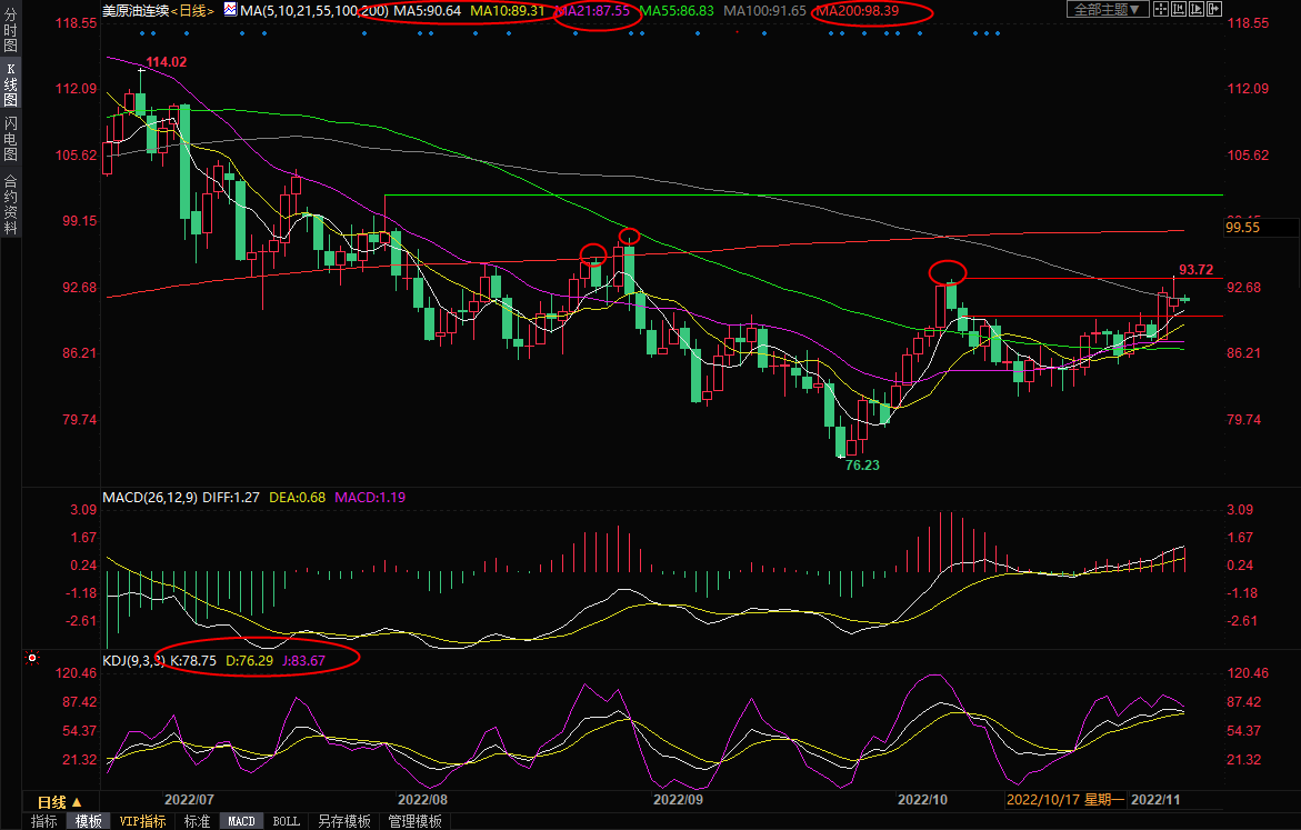 由于上一交易日油价冲高受阻于10月10日触及的近两个月高点93.61附近阻力,并回落至布林线上轨93.06下方,KDJ也发出短线超卖信号,也需要提防油价的进一步震荡回落风险,初步支撑在5日均线90.64附近,然后是90整数关口,失守该位置前,后市仍偏向多头。10日均线支撑在89.31附近,21日均线支撑在87.55附近,若回落至该位置下方,则增加短线看空信号。