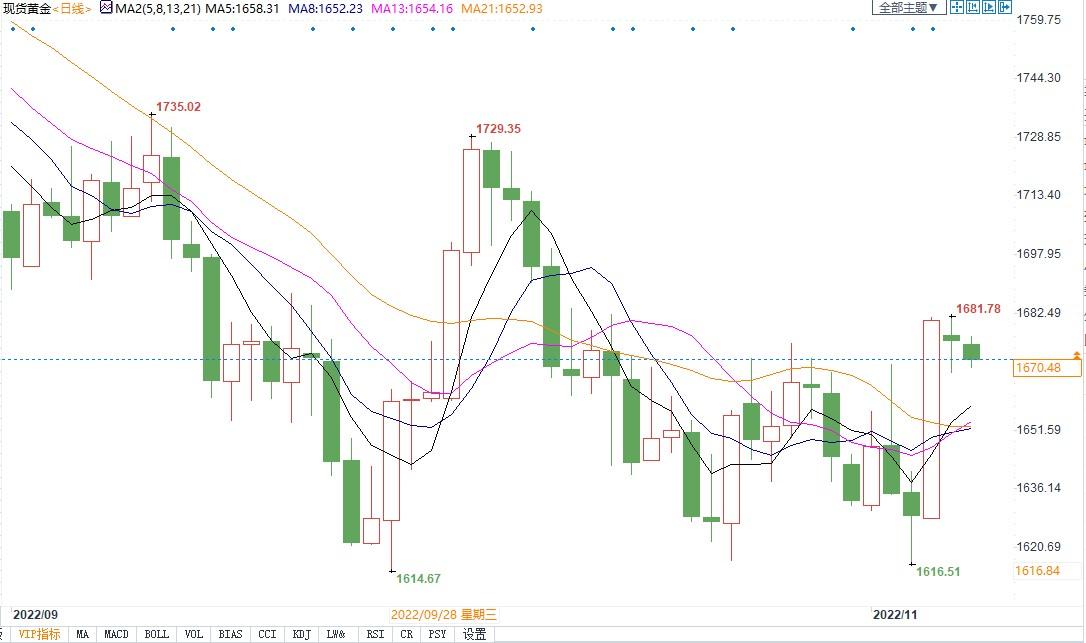 北京时间11月8日14:24,现货黄金报1670.20美元/盎司