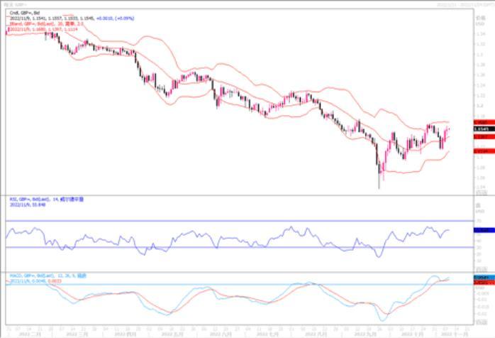 周二(11月8日)德国公债收益率攀升推动欧元走强。由于对欧洲央行进一步收紧政策的预期,德债收益率稳步攀升,削弱了美元,也令欧元区和美国公债收益率差收窄,两年期德债收益率升至2.196%,比一周前高了25个基点。而且周一公布的一项调查显示,欧元区11月投资者士气有所改善,这是三个月来首次上升,反映出投资者希望近期气温上升和能源价格下跌将避免今年冬天欧洲实行天然气配给。欧元兑美元上涨0.48%,至1.0067美元。日线图上,欧元兑美元再度攀升之两周前的高点1.0093附近,各类技术指标配合性的上扬;4小时图上,汇价穿越各短期均线上方,MACD红色动能柱向上发散,显示欧元多头开始活跃。日内留意1.0093-1.0100区域的阻力硬度,若再度遇阻,小心在图形上形成双顶形态。而如果能突破,上方目标将是8月份到过的高点1.0320-1.0360区域。