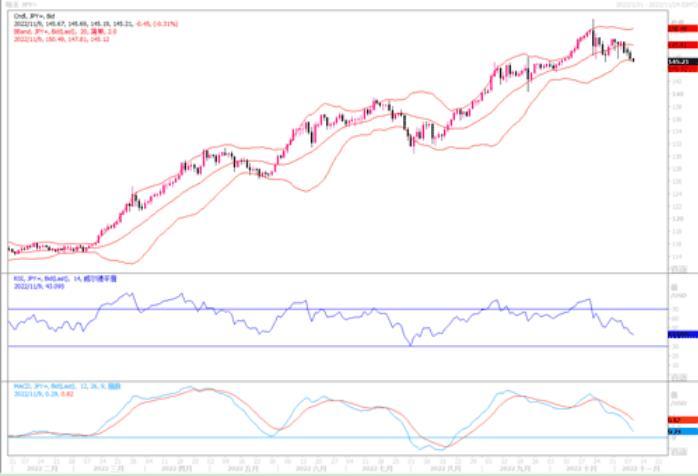 美元/日元周二下跌0.65%收盘在145.68。隔夜10年期美国公债收益率降至4.121%,两年期收益率为4.651%,而美元的普遍回落,提携了日元的回升。且有传言,日本政府以抛售美债的形式加强对日元汇率的干预。日线图上,美元兑日元渐渐脱离短期均线下方,MACD绿色动能柱向下发散,RSI向超卖区域挺进,目前震荡区域下沿145.00的支撑显得尤为关键,一旦跌穿,美元兑日元回撤幅度将加大。上方150.00整数关口则成为近期美元兑日元较为强烈的阻力位置。
