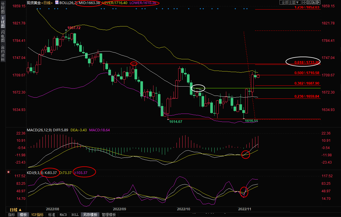 日线级别:震荡上涨;MACD金叉,KDJ金叉,5日均线上穿55日均线,金价此前顶破了1807-1614跌势的38.2%回撤位1687.90阻力和1700关口,失守1687.90前,后市仍偏向多头,短线继续关注布林线上轨1716.20附近阻力,100日均线阻力(目前在1714.89)也该位置附近,若能站稳在该位置上方,则有望进一步涨向9月12日高点1735.02附近,该位置也是过去两个多月的高点阻力所在,10月4日曾上冲该阻力后回落,金价需要顶破该阻力,才能打开中线上涨通道。