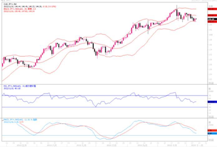 周三美元/日元反弹,美国期中选举开始前在亚洲时段曾暴跌至145.18纽约时段高见146.79,亚洲盘到目前为止交投于146.26-48。有消息称日本进口商在跌至146.00时重新进场,而146.50以上又有出口商卖盘。美债收益率下降以及美期中选举后市场风险厌恶情绪弥漫,或有利于日元。日线隔夜市场上虽收了个小阳线,收盘再次触及前低密集支撑区;从4小时来看,布林中轨偏下,MACD零轴下方运行,上方第一阻力146.50,第二阻力147.30,下方支撑145.00,144.50-60,保持在第一阻力下方短线有望继续测试第一支撑。