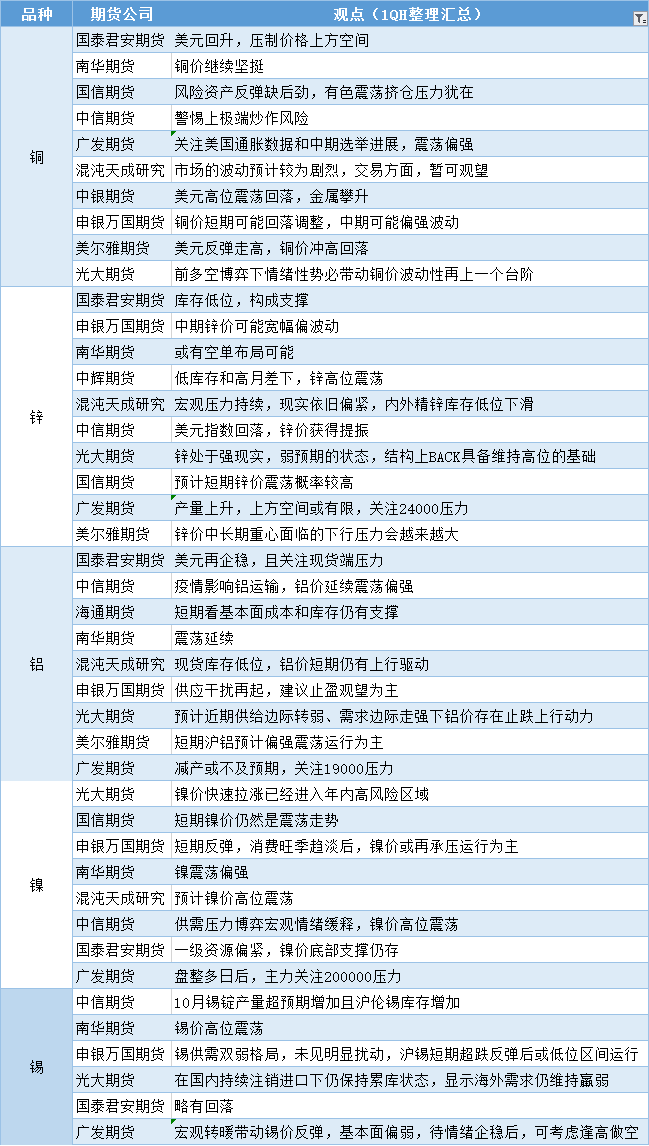 标题:期货公司观点汇总一张图:11月10日有色系(铜、锌、铝、镍、锡等)