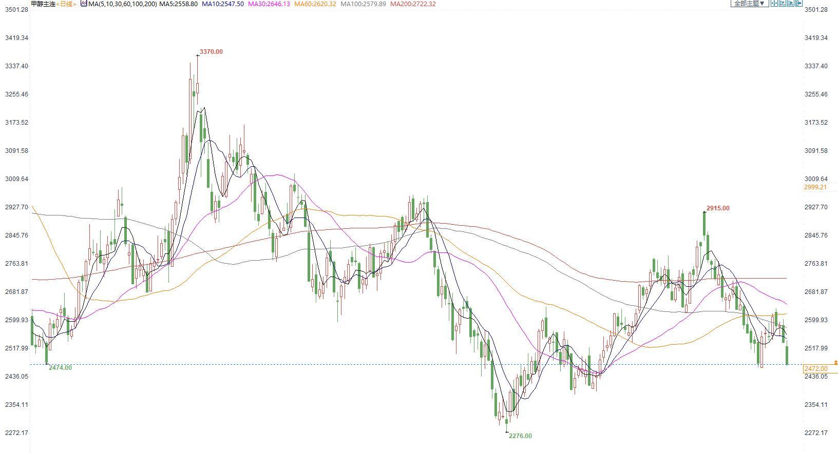 期货市场,甲醇2301合约跌超2%,收盘价2472。江苏现货报价2860-2890,现货在低库存支撑下,强势于期货价格。