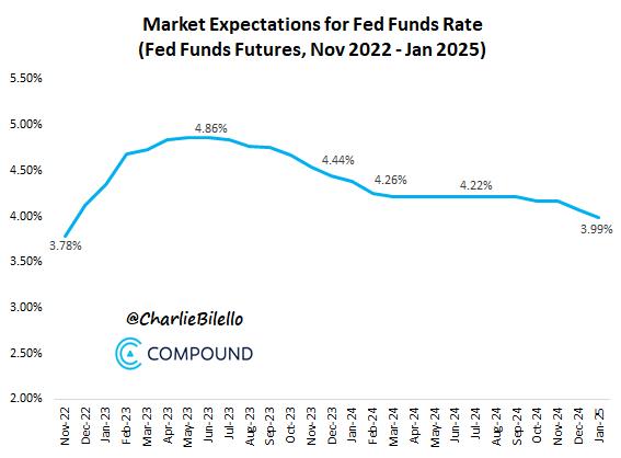 正如Compound?Capital?Advisors创始人兼首席执行官Charlie?Bilello在最新推文中所提到的,当前利率市场的定价显示,美联储可能在明年2月和3月再分别加息25个基点,随后将进入一段为期约半年的等待和暂停期,而到了明年11月,美联储就将开启降息周期,并一路持续到2024年。