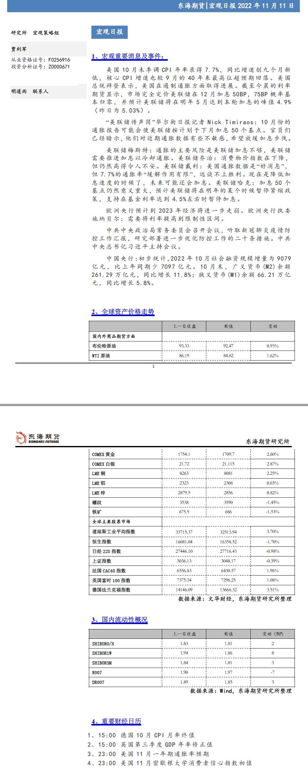 标题:【东海期货11月11日宏观日报】:美国通胀超预期回落,全球风险资产大幅反弹
