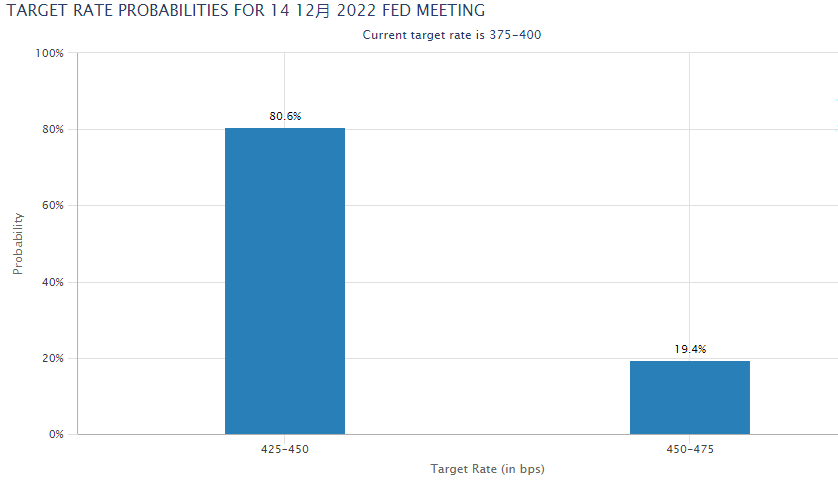 市场参与者现在认为,美联储在12月会议上至少加息50个基点,但连续第五次加息75个基点的可能性不到20%?;平鸨皇游ㄕ投猿骞ぞ?,但利率上升会增加持有非孳息资产黄金的机会成本。