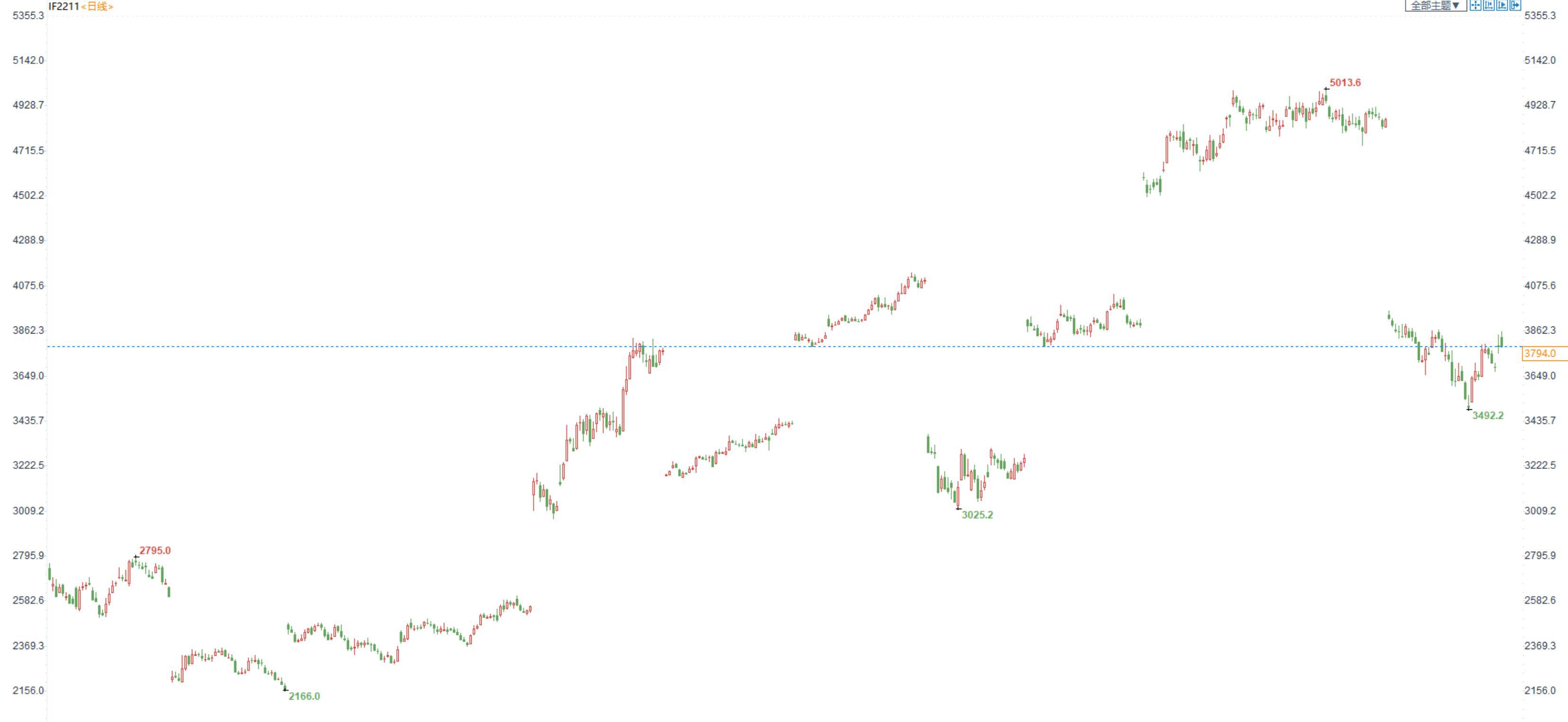 【今日涨跌】四大期指仅IH小幅收涨。IH2211收盘价为2537.6,收涨0.33%;IF2211收盘价为3794,收跌0.52%;IC2211收盘价为6126.4,收跌0.86%;IM2211收盘价为6592.2,收跌1.40%。