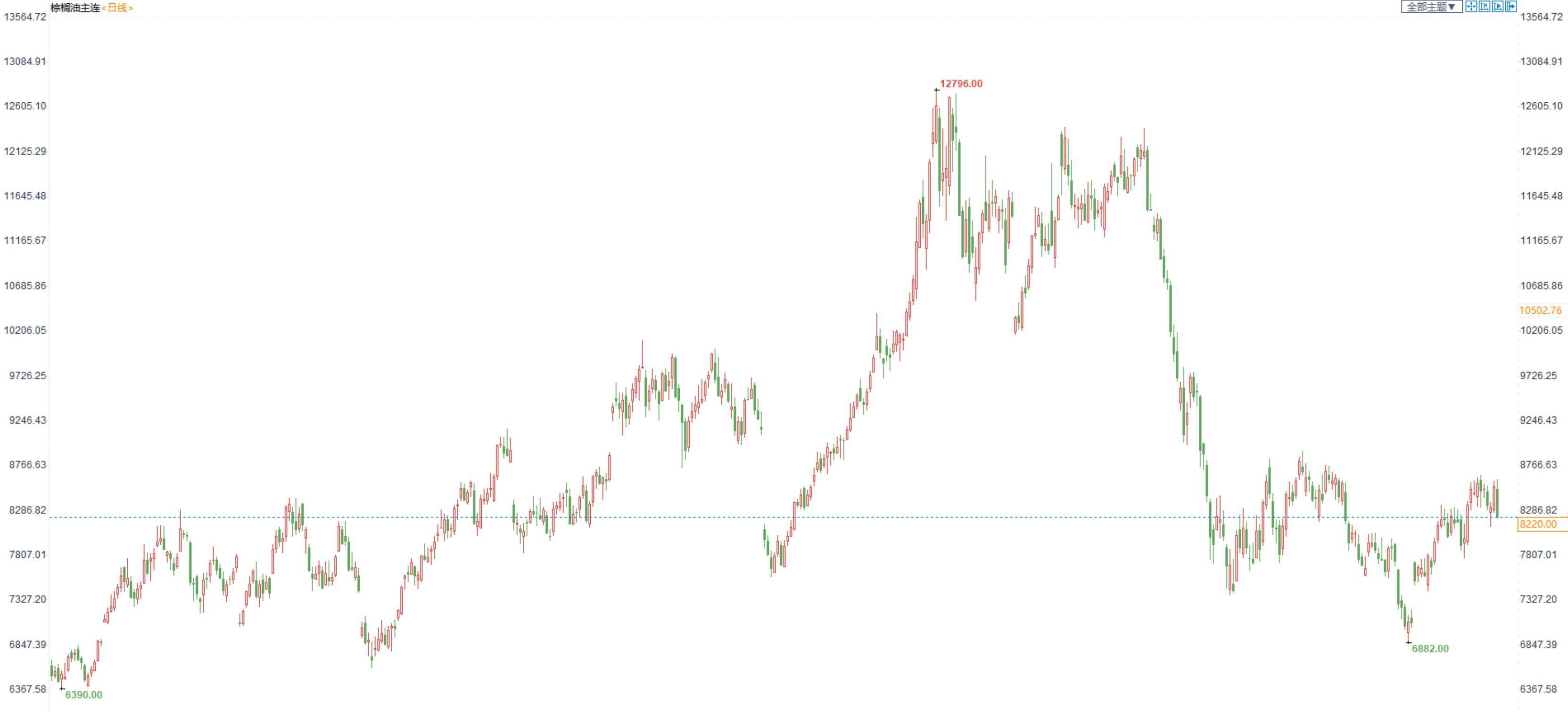 棕榈油2301合约日内跌2.35%,收盘8220元/吨;广州市场棕榈油8540元/吨。