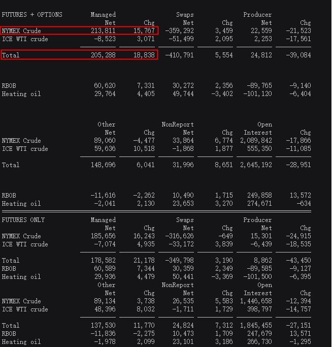 原油方面,美国商品期货交易委员会(CFTC)数据还显示,11月8日当周,投机者所持NYMEX?WTI原油净多头头寸增至213811手合约,创最近逾15周新高。投资者在纽约和伦敦的原油综合期货和期权净多头头寸增加?18838?份合约至?205288?份。