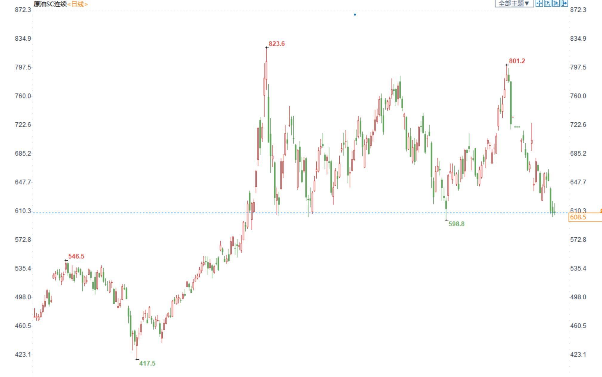 期货市场,布油在83美元附近震荡整理,国内SC2211合约小幅收跌,收盘价608.5。