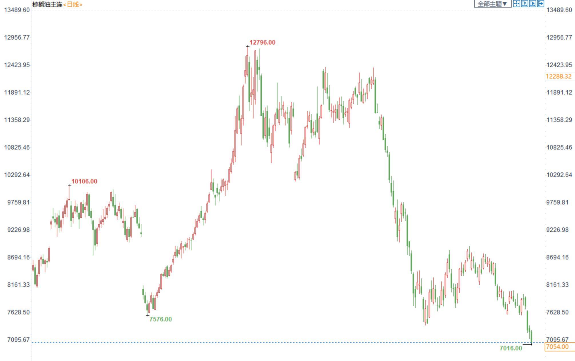 棕榈油2301合约日内跌2.84%,收盘7054元/吨;广州市场棕榈油7480元/吨。