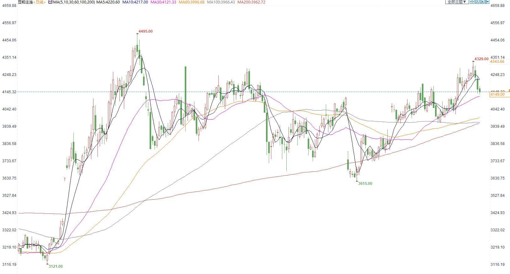 豆粕2301合约日内跌1.00%,收盘价4149元/吨,现货张家港43%蛋白豆粕5455元/吨。