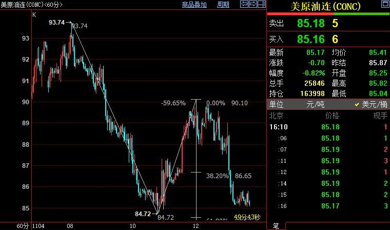 北京时间16:11,NYMEX原油期货下跌0.75%至85.23美元/桶;ICE布伦特原油期货下跌0.49%至92.68美元/桶。