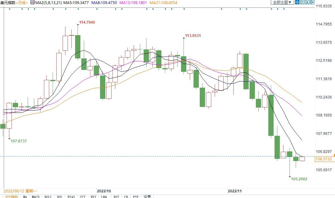 美元指数在9月底创下了114.1的多年高点,The?Technical?Trader的分析师Bill?McNamara表示:“尽管此后价格走势有些波动,但从图表展望来看,仍然没有什么迹象表明美元指数即将出现重大逆转。然而,这就是上周美元在通胀数据的影响下暴跌的结果:美元收盘下跌3.8%,这是自2020年3月以来最大的单周跌幅……很难想象这没有标志着反弹的结束。”?