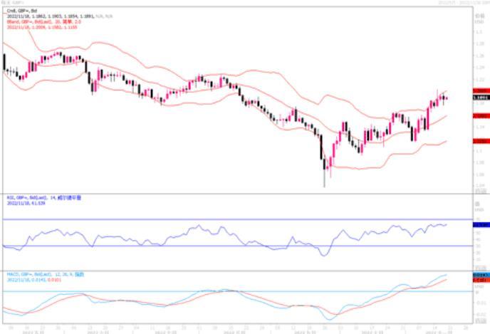 周四(11月17日),英镑兑美元微跌0.46%,报收于1.1865。这主要是投资者对英国财政大臣亨特的预算案感到担忧,其中包括增税和收紧公共开支,以推动通胀降温并重塑英国的经济声誉。有份认为,亨特预算案有缺口,从市场的?角度来看,并那么能打动人。预算案明显欲通过打击消费者来堵住缺口。且目前经济正在下行,还有生活成本危机,他们却在加税,势必影响到英国经济的发展。日线图仍守稳5日均线上方,但随机指标倾向自超买区域回落,关注修正的可能性。4小时图随机指标熊背离。临近周末时段,要继续防范高位回落的风险。上方初步阻力在1.19-1.1958区域,下方初步支撑则在1.1760附近。