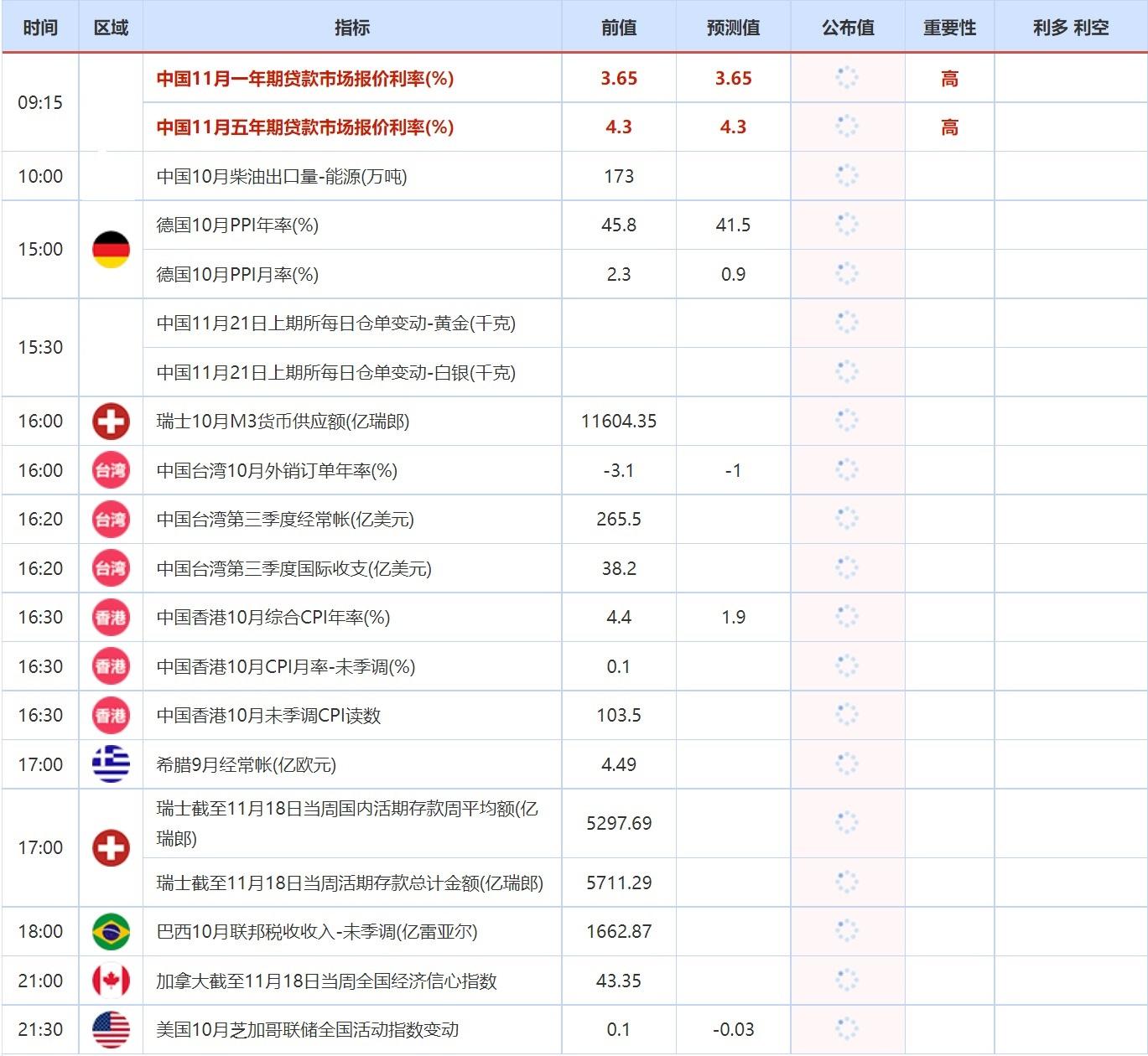 09:15?中国11月一年期贷款市场报价利率(%)?,?前值?3.65?,?预期值?3.65?,?公布值:待发布