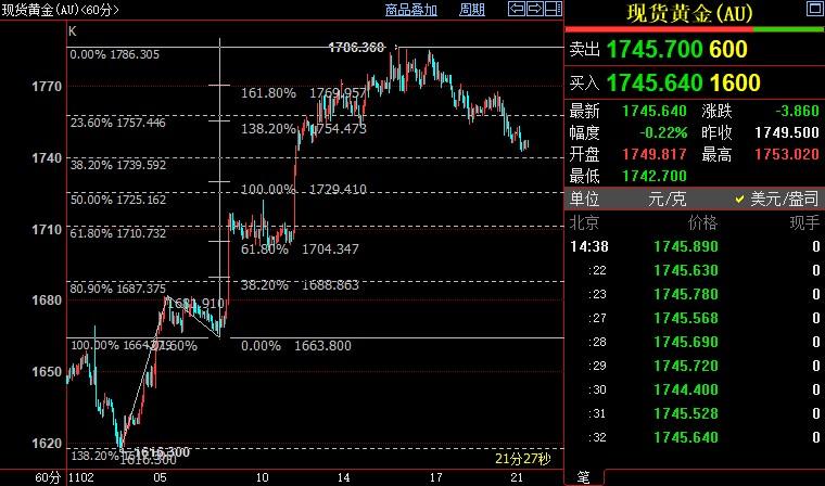 北京时间19:39,现货黄金下跌0.54%至1740.08美元/盎司;COMEX期金主力合约下跌0.72%至1741.7美元/盎司;美元指数上涨0.69%至107.746。