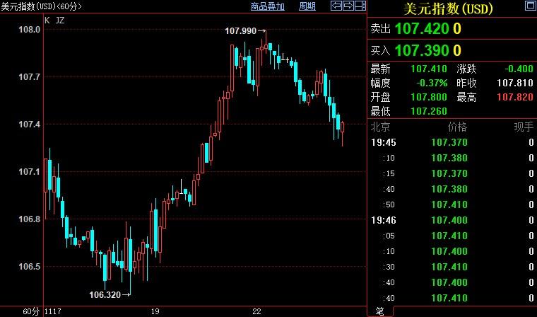 北京时间19:46,现货黄金上涨0.54%至1747.27美元/盎司;COMEX期金主力合约上涨0.51%至1748.5美元/盎司;美元指数下跌0.39%至107.406。