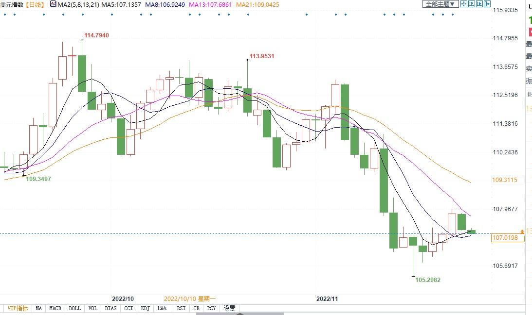 北京时间11月23日13:32,美元指数报107.04