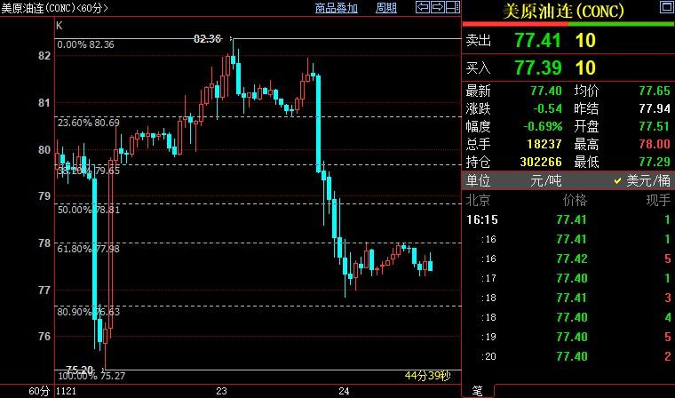 北京时间16:15,NYMEX原油期货下跌0.69%至77.40美元/桶;ICE布伦特原油期货下跌0.62%至84.61美元/桶。