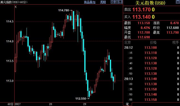 北京时间20:13,现货黄金下跌0.57%至1650.31美元/盎司;COMEX期金主力合约下跌0.71%至1658.2美元/盎司;美元指数上涨0.41%至113.157。