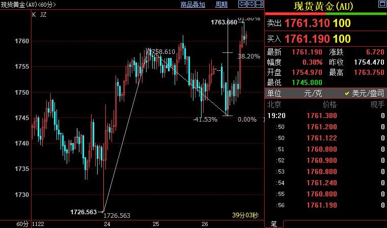 北京时间20:27,现货黄金上涨0.27%至1757.78美元/盎司;COMEX期金主力合约上涨0.20%至1757.5美元/盎司;美元指数下跌0.51%至105.60。
