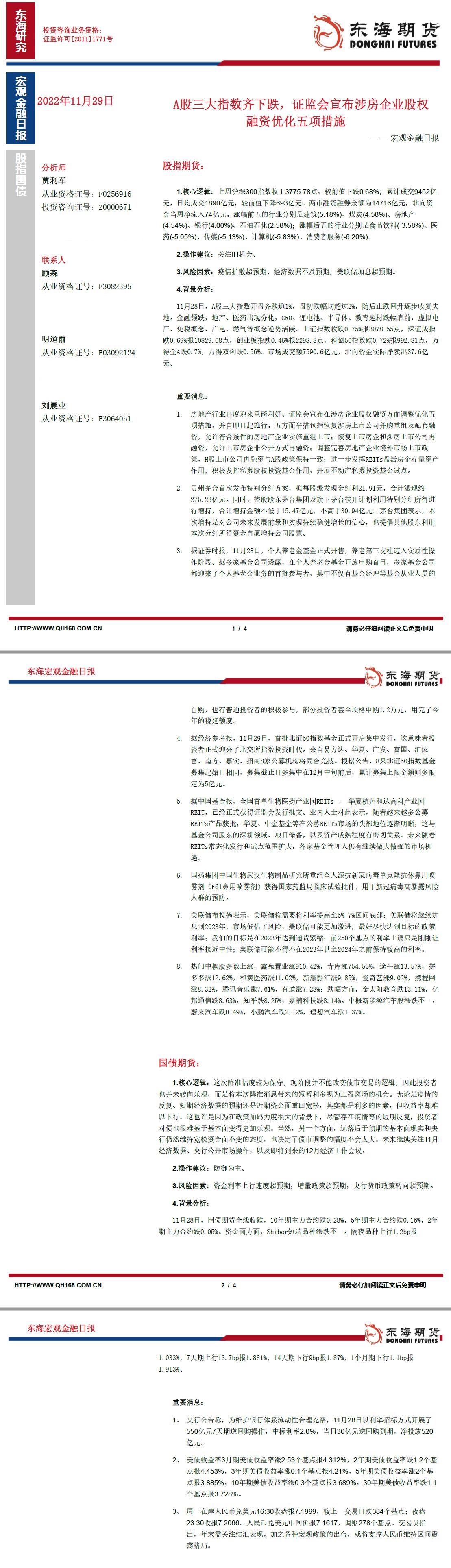 【东海期货11月29日金融期货日报】:证监会宣布涉房企业股权融资优化五项措施,未来继续关注11月经济数据