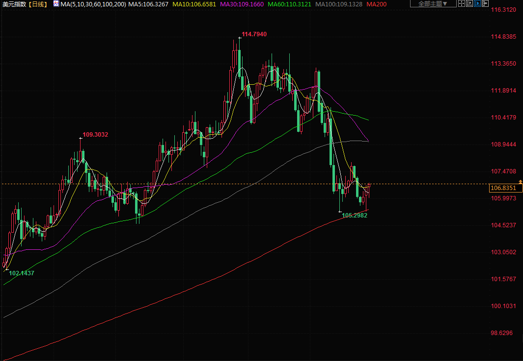 ??美元指数降至106.82,9月28日曾创下114.78的20年最高。投资者期待着美联储在明年初达到利率峰值,预计届时通胀压力将消退。