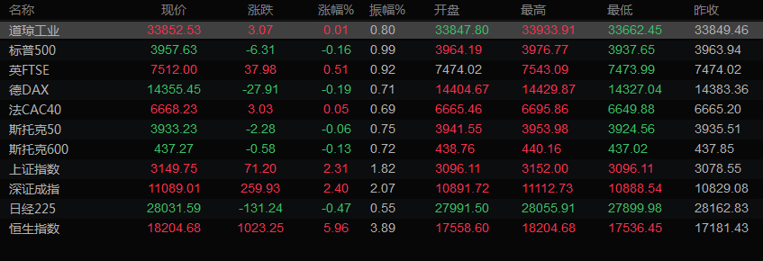 美股收盘情况:标普500指数下跌0.16%,收报3957.60点。纳斯达克指数下跌0.59%,收报10983.78点;道琼斯工业指数上涨0.01%,收报33852.13点。